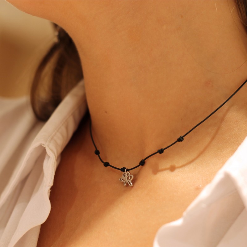 Colgante de plata de primera ley con baño de rodio con cordón de color negro.